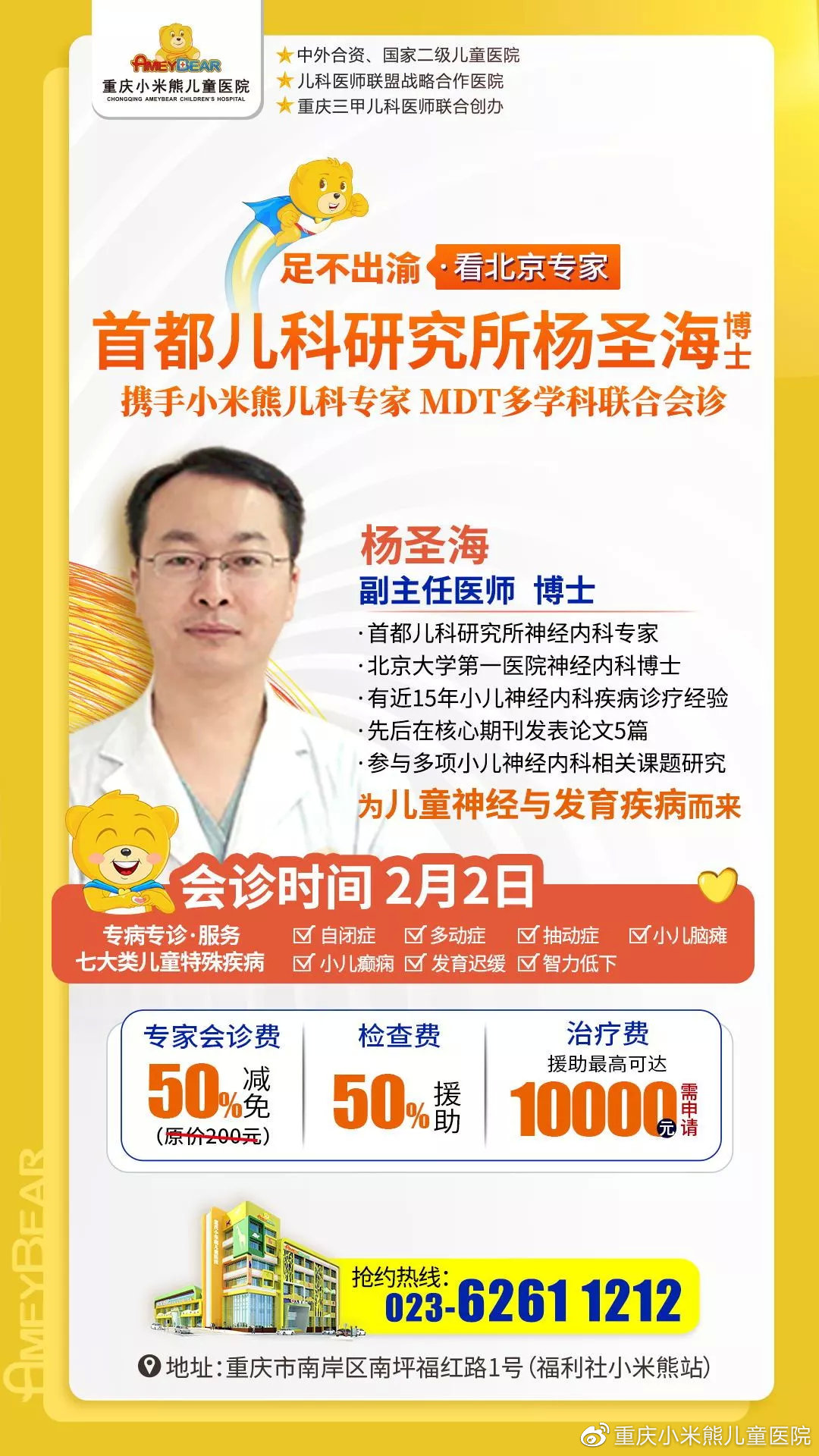 为给更多家庭带来希望,来自首都儿研所(新中国第一家儿科医学研究所,也是国内目前在儿科康复领域拥有最先进的诊疗技术及专家资源的儿科医疗机构)副主任医师、北京大学小儿神经内科博士杨圣海,将于2月2日(大年初九)来到重庆小米熊儿童医院,与我院专家共同为多动症、自闭症、脑瘫、智力障碍等特殊疾病患儿进行联合会诊。患儿家长可通过报名提前预约会诊名额,给孩子康复的希望!