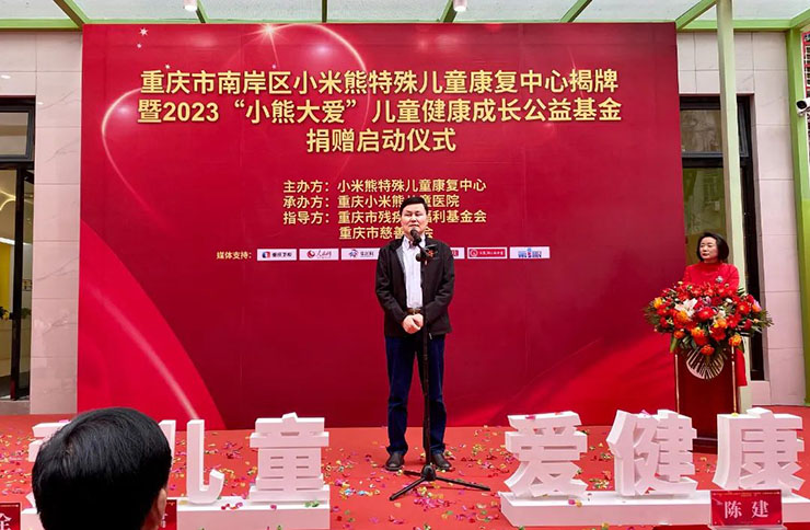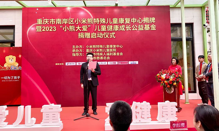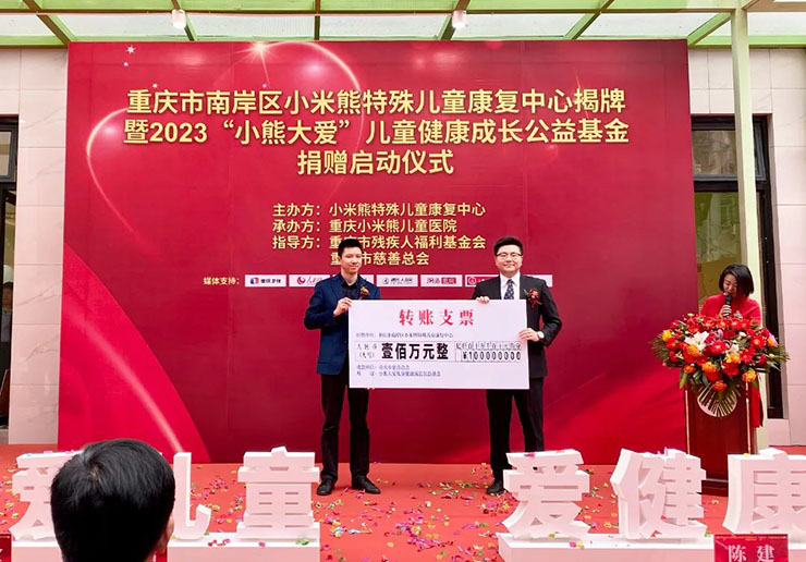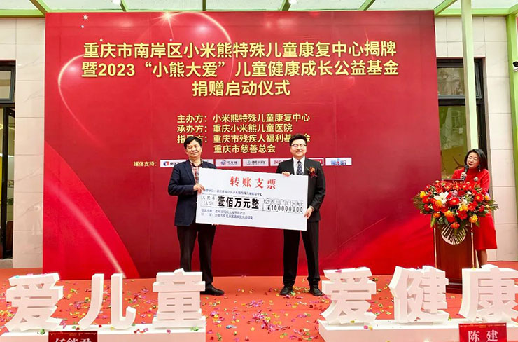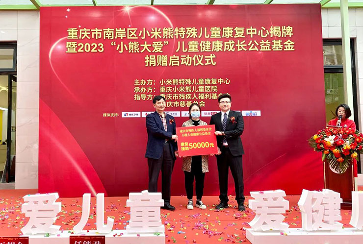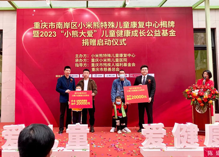 同时,胡欣先生也向重庆市慈善总会捐赠了“2023年度小熊大爱儿童健康成长公益金100万”,用于贫困特殊疾病儿童的医疗救助。并同时向多指患儿家庭和矮小症家庭分别捐赠2万元援助治疗。重庆市慈善总会陈建部长表示:此次特殊儿童康复中心揭牌暨2023年度小熊大爱捐赠仪式既响应了习总书记关于要关爱残疾团体的号召,也符合了当今儿童特殊疾病高发的社会需求,是真正可以帮助弱势群体和传递正能量的行为,相信今后通过双方一起努力,可以为重庆慈善事业作出贡献。