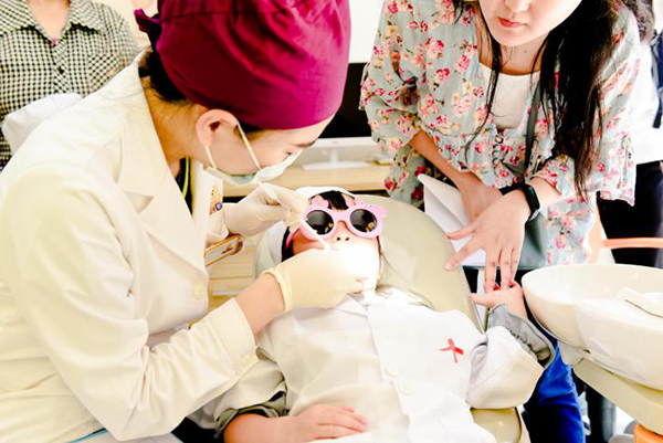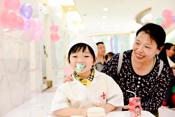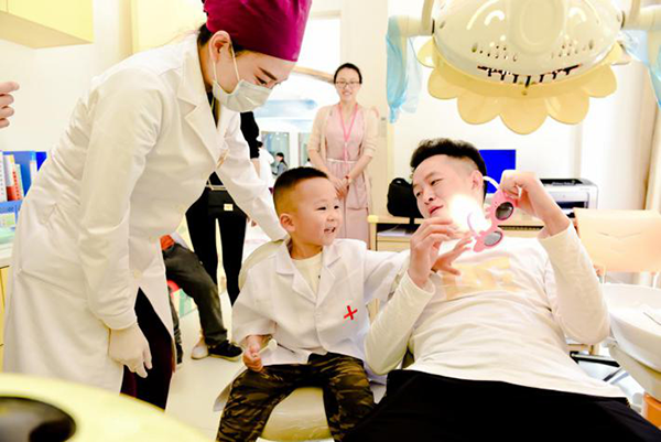 在接下来的小牙医职业体验中,小朋友们在叶主任的指导下给家长们检查牙齿。“妈妈,你的大牙坏掉了!”“爸爸,你有两颗蛀牙了,要爱护牙齿呀!”“奶奶有五颗假牙,我一颗都没有~”等童言趣语层出不穷,更有萌萌的小牙医紧紧地抱住我们造型可爱的的恐龙儿童牙椅,不肯离开,体验现场欢笑不停。