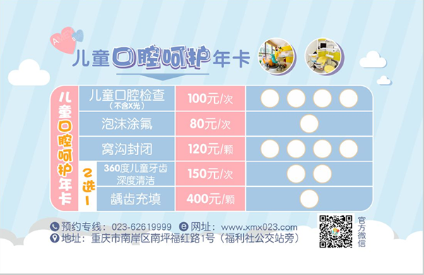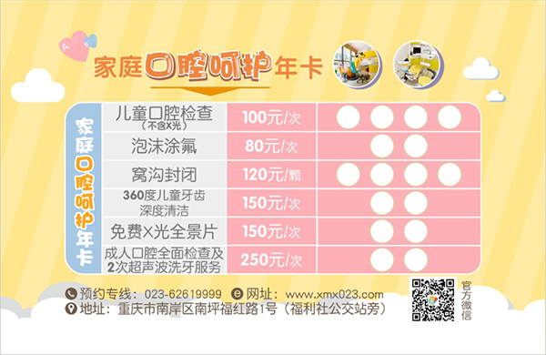 开业期间,小米熊口腔科特别推出了“儿童口腔呵护年卡”和“家庭口腔呵护年卡”,给宝宝和你一整年的口腔呵护!